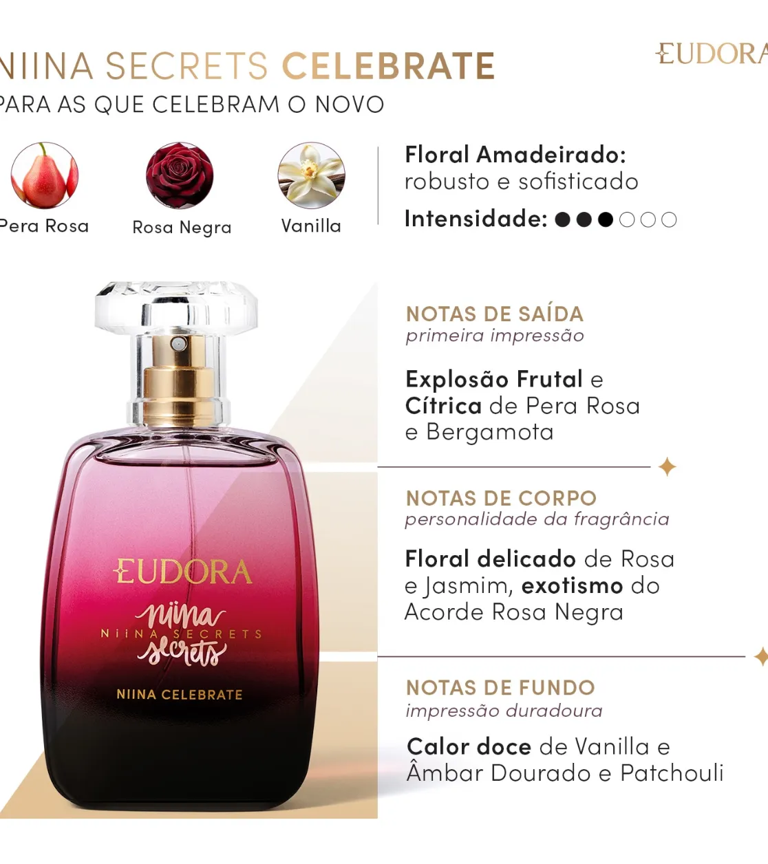 Fragrância: rosa negra, pera rosa e baunilha